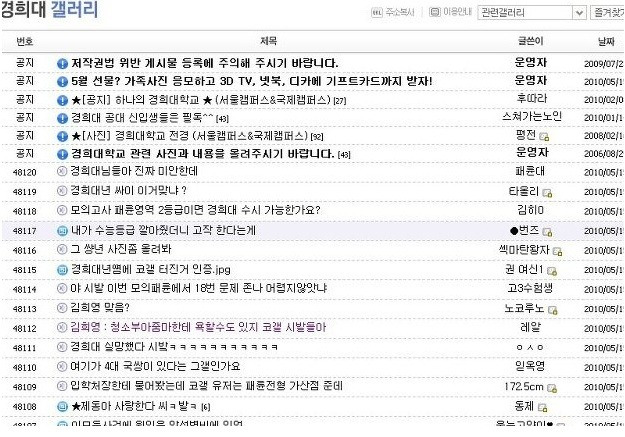 ※사건의 전말※ 1. 2010년 5월 15일 14시 02분 네이트에 경희대 패륜녀사건이 포스팅되자 구설수에 오르기 시작. 본문스크랩. http://paran.nate.com/b201783786 제가 태어나서 가장 비참하고, 제 자신의 존재가 쓸모없어 보이는 날이되었습니다.. 딸 뻘 되는 여학생에게 어머니가 갖은 모욕을 당했습니다. 이 글을 쓰는 지금도 손이 부들부들 떨립니다. 어머니께서 정확하게 기억은 못하시지만 대략적인 상황을 설명하면 다음과 같습니다. 경희대 학생분 들이라면 좀 더 유심히 봐주세요ㅠ_ㅠ 특히 이 현장을 목격하신 분 있으시면, 힘을 실어주세요 때 : 2010년 5월 13일 12시 15분경 장소 : 경희대학교 청운관 지하 2층 식당 정문 옆 남쪽 여자화장실과 여학생 휴게실 화장실 정리를 ..