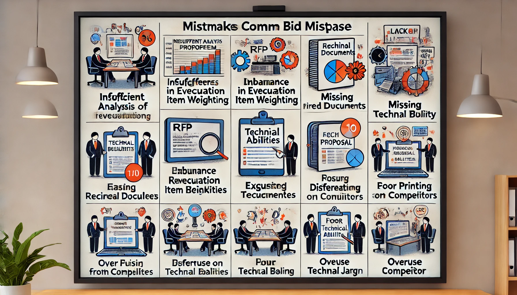 나라장터 입찰 제안서를 작성할 때 가장 흔히 저지르는 실수는 여러 가지가 있습니다. 이러한 실수들은 제안서의 완성도를 떨어뜨리고, 평가에서 불이익을 초래할 수 있습니다. 아래에 주요 실수와 그 원인, 그리고 이를 방지하기 위한 방법을 자세히 설명하겠습니다.