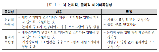 이렇게 3단계로 개념이 분리되면서 각각의 영역에 대한 독립성을 지정하는 용어가 바로 논리적인 독립성과 물리적인 독립성이다.