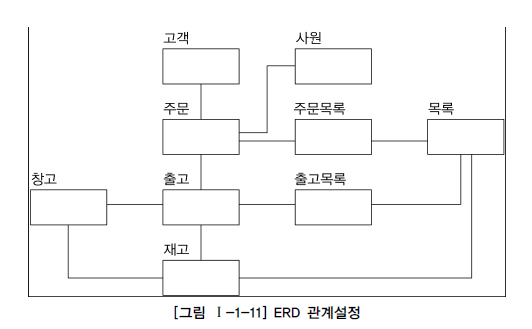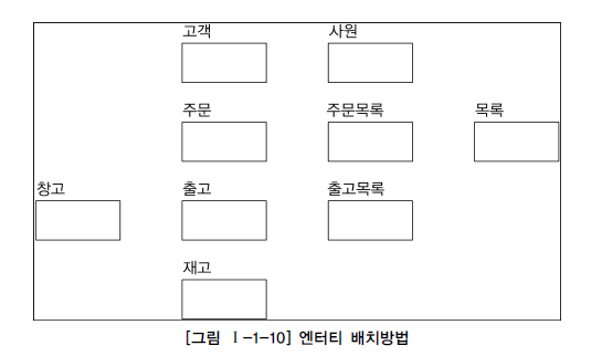[그림 Ⅰ-1-10]의 데이터 모델에서도 가장 중요한 엔터티인 고객과 주문을 왼쪽 상단에 배치하여 다른 엔터티를 연결하는 방식으로 엔터티를 배치하였다. 주문에 따라 출고가 이루어졌으므로 주문이 위에 출고가 아래에 위치해 있다. 두 번째 업무흐름에 중심이 되는 엔터티, 보통 업무 흐름에 있어서 중심이 되는 엔터티는 타 엔터티와 많은 관계를 가지고 있으므로 중앙에 배치하도록 한다. [그림 Ⅰ-1-10]에서는 주문, 출고, 주문목록, 출고목록이 업무의 중심엔터티에 해당한다. 세 번째는 업무를 진행하는 중심엔터티와 관계를 갖는 엔터티들은 중심에 배치된 엔터티를 주위에 배치하도록 한다. [그림 Ⅰ-1-10]에서는 창고, 고객, 사원, 재고가 이에 해당한다.