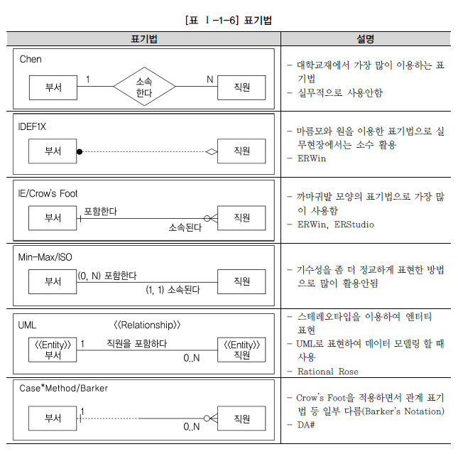 데이터 모델의 핵심 요소인 이 세 가지를 이용하여 일정한 표기법에 의해 데이터 모델을 만들어 낼 수 있다. 다음은 다양한 표기법에 의해 생성되는 데이터 모델의 표기법을 설명한다.