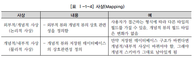 영어로 ‘Mapping’은 우리말로 ‘사상’이라고 번역되는데 이것은 상호 독립적인 개념을 연결시켜주는 다리를 뜻한다. 데이터독립성에서는 크게 2가지의 사상이 도출된다.
