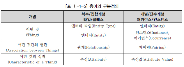 데이터 모델링에서는 이 세 가지 개념에 대해서 단수와 복수의 개념을 분명하게 구분하고 있고 실제로 데이터 모델링을 할 때 많이 활용되는 용어이다.