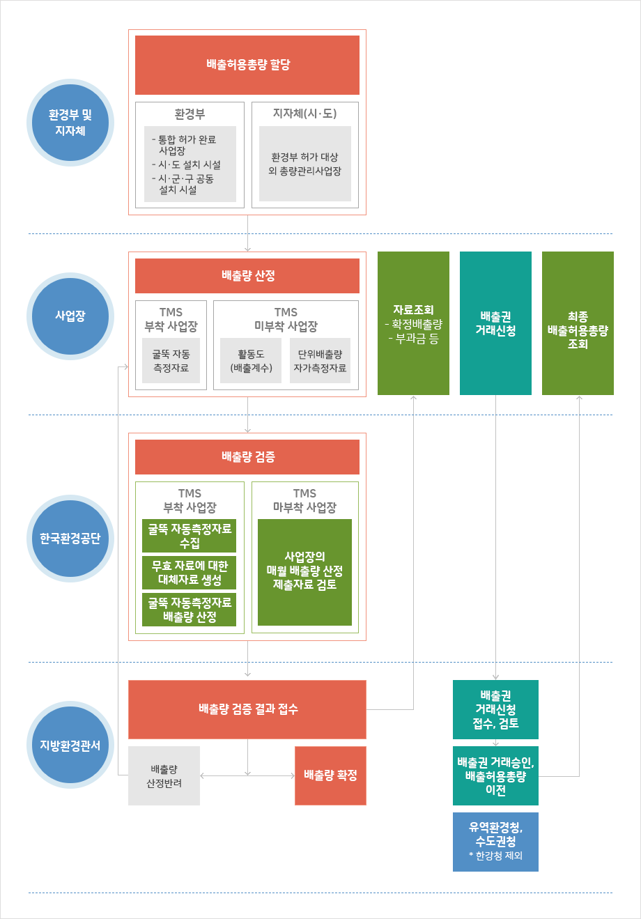 - 배출허용총량 이행 관리 및 배출권 거래자료의 제공 등 환경부 및 지방자치단체의 정책지원 실시
