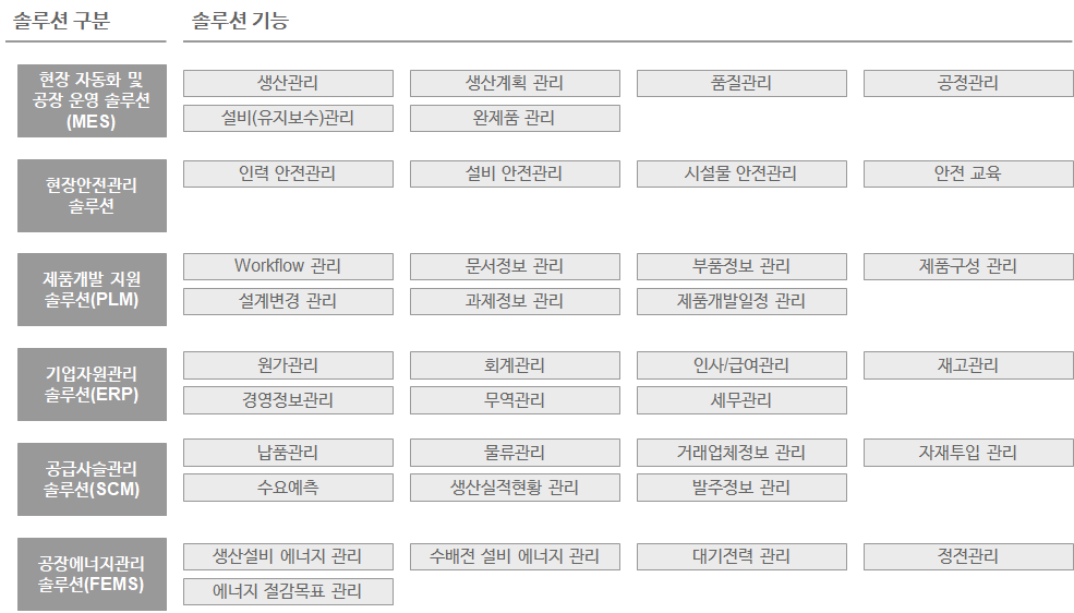 스마트팩토리를 운영하기 위해 존재하는 대표적인 솔루션을 보자면 아래와 같다