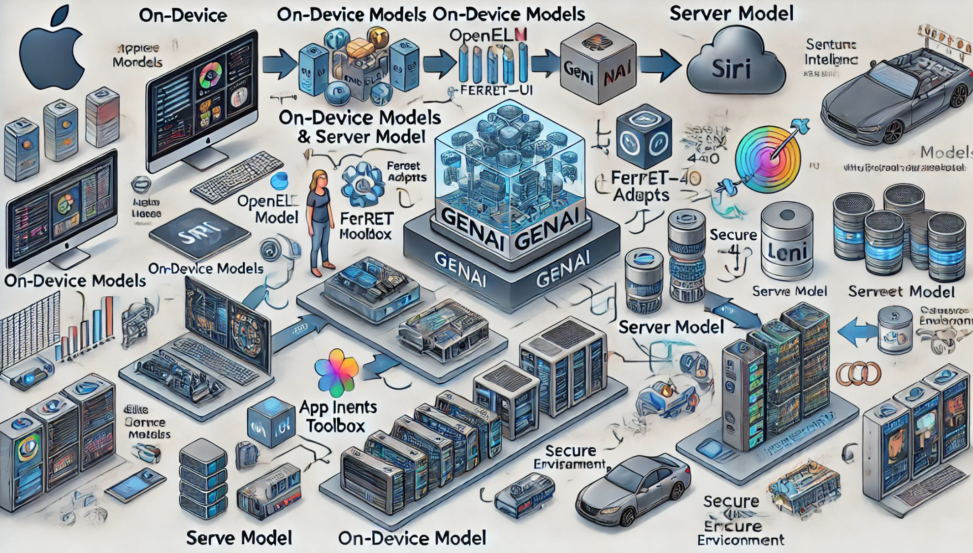 애플 인텔리전스는 온디바이스 모델(OpenELM 및 이미지 모델)과 서버 모델(프라이빗 클라우드 컴퓨팅 Apple 모델 스택)로 구성됩니다. 오케스트레이션 알고리즘은 사용자 요청이 기기 내에서 처리될지, Apple 서버 모델로 처리될지, ChatGPT로 전달될지를 결정합니다. 앱 인텐트 툴박스는 Siri와 모델이 다양한 앱과 상호 작용할 수 있도록 지원하며, 시맨틱 인덱스는 벡터 데이터베이스로서 데이터를 검색하고 상호 작용할 수 있게 합니다.