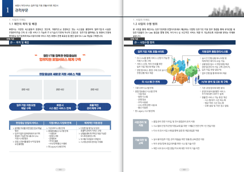 | Ⅰ. 일반현황 1. 제안사 일반현황 2. 제안사의 조직 및 인원 3. 수행조직 및 업무분장 4. 투입인력 및 이력사항 Ⅱ. 전략 및 방법론 1. 사업이해도 2. 추진전략 3. 적용기술 4. 표준 프레임워크 적용 Ⅲ. 기술 및 기능 1. 시스템 요구사항 2. 기능 요구사항 3. 보안 요구사항 4. 시스템 운영 요구사항 5. 제약사항 Ⅳ. 성능 및 품질 1. 성능요구사항 2. 품질요구사항 Ⅴ. 프로젝트 관리 1. 관리 지원 방안 2. 일정계획 Ⅵ. 프로젝트지원 1. 품질보증 2. 시험운영 3. 교육훈련 4. 유지보수 5. 기밀보안 6. 비상대책 Ⅶ. 하도급 계약의 적정성 1. 하도급 계약의 적정성(해당시) |