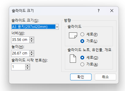 이렇게 파워포인트에서 A3 를 설정하면 크기가 조금 다릅니다.
