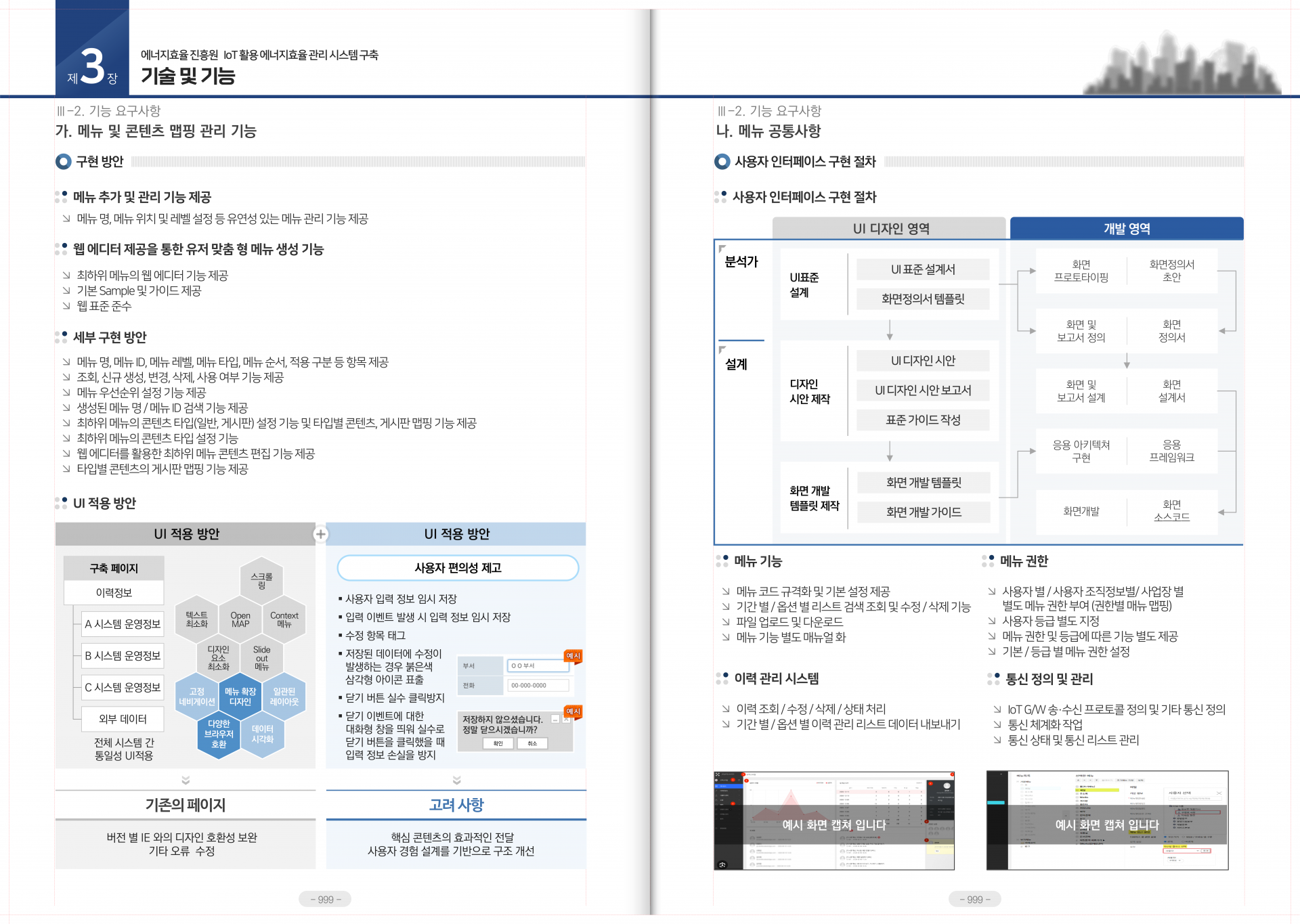 | Ⅰ. 일반현황 1. 제안사 일반현황 2. 제안사의 조직 및 인원 3. 수행조직 및 업무분장 4. 투입인력 및 이력사항 Ⅱ. 전략 및 방법론 1. 사업이해도 2. 추진전략 3. 적용기술 4. 표준 프레임워크 적용 Ⅲ. 기술 및 기능 1. 시스템 요구사항 2. 기능 요구사항 3. 보안 요구사항 4. 시스템 운영 요구사항 5. 제약사항 Ⅳ. 성능 및 품질 1. 성능요구사항 2. 품질요구사항 Ⅴ. 프로젝트 관리 1. 관리 지원 방안 2. 일정계획 Ⅵ. 프로젝트지원 1. 품질보증 2. 시험운영 3. 교육훈련 4. 유지보수 5. 기밀보안 6. 비상대책 Ⅶ. 하도급 계약의 적정성 1. 하도급 계약의 적정성(해당시) |
